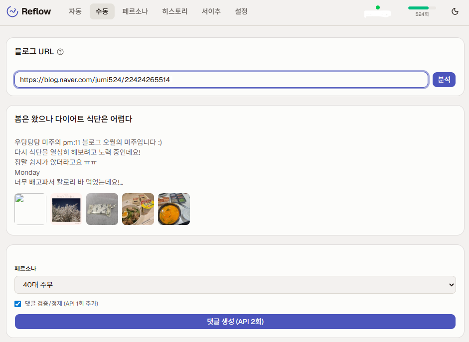 육아·결혼 블로그와 여행 블로그 두 개를 직접 운영하며 Reflow 로 댓글·공감 소통을 관리 중입니다. 댓글 관리 시간을 줄이면서 방문 흐름 유지에 도움.